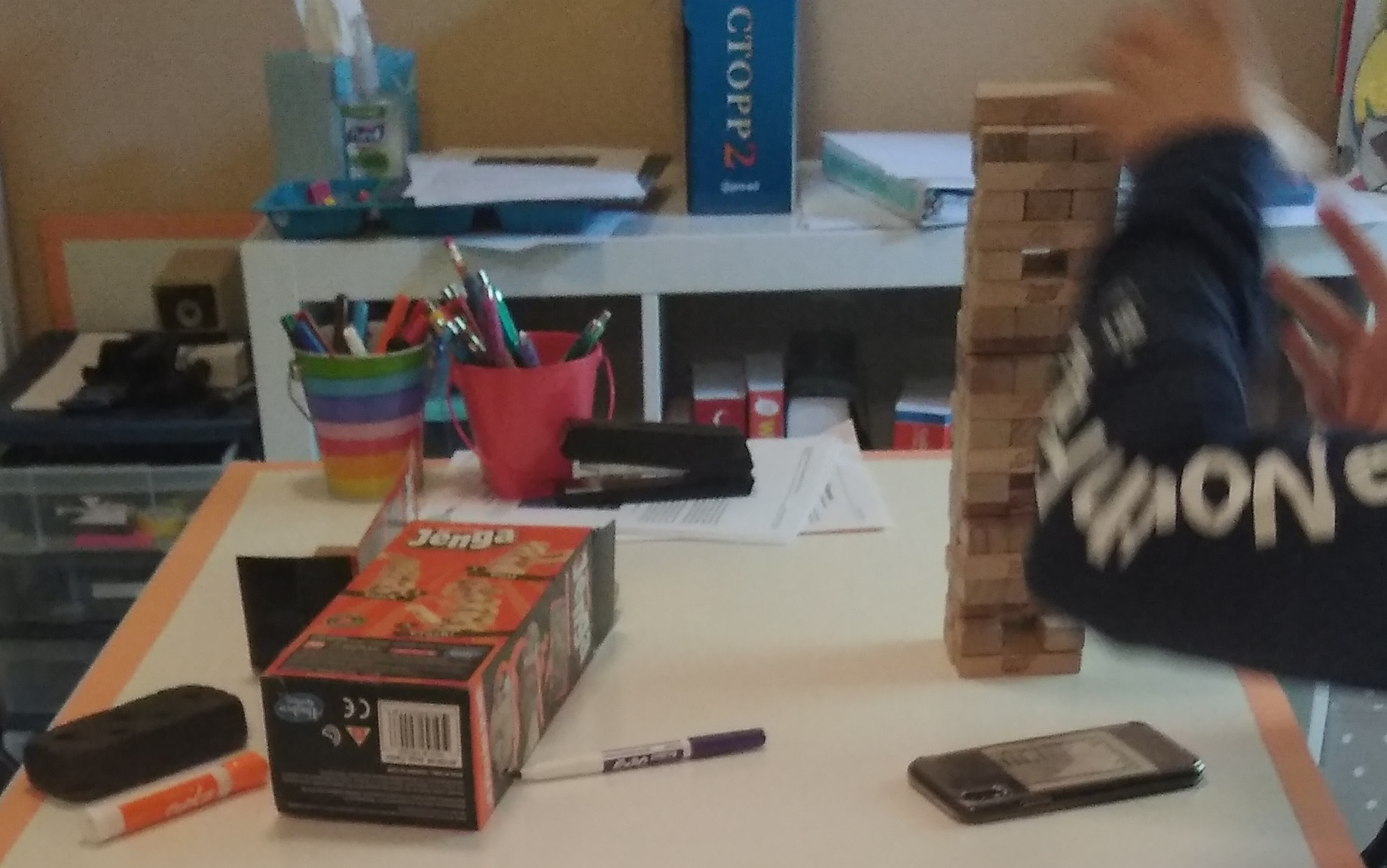 To finish off our session, we played one Jenga block after writing out a word sum This is Rory’s favorite part of the lesson and we get very competitive. We keep playing until we run out of words to build or our tower falls down.